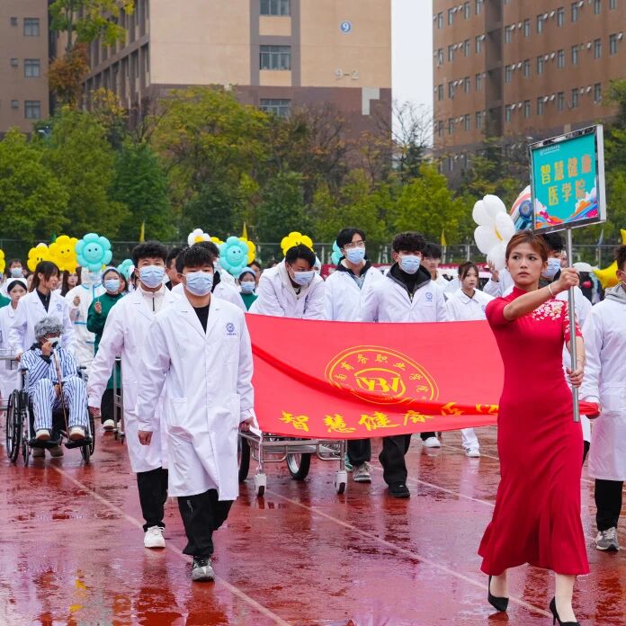 开幕式上,智慧健康医学院特色方队成为全场瞩目的焦点。队员们身着洁白的医护服,手持各专业元素道具,迈着整齐划一的步伐向主席台行进。行进至主席台前,方队成员迅速变换阵形,现场展示起传统养生功法八段锦,舒展的动作、专注的神情,将医学健康理念与中华传统养生文化巧妙融合,既展现了未来医务工作者的专业素养,也传递了积极健康的生活态度,赢得了现场师生的热烈掌声。