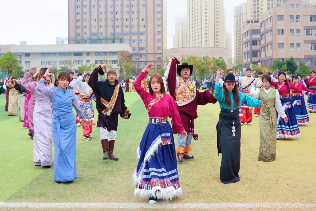 开幕式特色节目表演环节,智慧健康医学院的学子们轮番登场,献上了一场活力与美感兼具的视听盛宴。首先登场的啦啦操表演,队员们身着色彩鲜明的服装,伴随着动感的音乐跳跃、旋转,整齐划一的动作充满青春活力,瞬间点燃全场气氛;随后的伞舞表演别具韵味,舞者手持绘有民族纹样的油纸伞,轻盈转身、缓步挪移,将东方美学的温婉与灵动展现得淋漓尽致;最后,“民族大团结—起舞”节目压轴登场,学院藏族同学跳起欢快的舞蹈,展现了学院学子的多元文化风采,也传递出团结奋进的美好愿景,引得台下掌声与欢呼声不断。